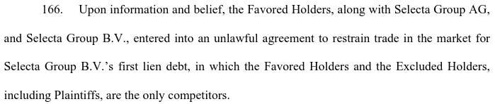 Because “excluded” 1L noteholders Deltroit Directional Opportunities Master Fund Limited, Algebris UCITS Funds P.L.C., Fineco Asset Management DAC, CQS Credit Multi Asset Fund, CQS Brunel Multi Asset Credit Fund, CQS Alternative Credit Fund, CQS New City High Yield Fund Limited, Mercer Multi-Asset Credit Fund, Faros Point Credit Opportunities Limited (collectively, the “excluded holders”), represented by Faegre Drinker Biddle & Reath LLP (“FDBR”), were pissed off they didn’t get invited to play with the AHG even after they asked (😢), don’t want to live with the new 1O notes’ sh*tty lower consent threshold (😭), and, on October 28, 2025, sued (i) the company, (ii) AHG-members Invesco Ltd., Man Group plc, Strategic Value Partners LLC, Diameter Capital Partners LP, (iii) Selecta CFO and board member Nicole Charriere, (iv) board members Ruud Gabriels, Robert Plooij, Bob Rajan, Jason Clarke, and (v) John Does 1-10 in the Southern District of New York’s district court.